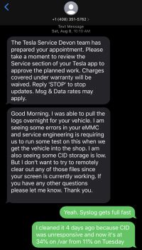 So I start getting texts from a technician... he is trying to get inside my car but he does not have much success... I tell him that some of the errors are clean because I switched the EMMC banks. That's when I lost him. What do you mean? he asks. Your vehicle is not showing faulty EMMC errors at this time. I explained that I am a registered Security Researcher and that I happen to have access to my car's computers and that I do have screenshots of the logs full of errors. I also explained to him how I switched banks by redeployment. He tells me this is nothing that a Tesla Ranger can fix and I have to get my car in for service. He offered 8/10/2020 (a day earlier than the Ranger visit) and a Uber ride home. I explain to him I can not be without the car and that the car is "kind of" fixed and would rather bring it in when they have a loaner. He tells me that 8/25 is the first day they will have a loaner for me. I say OK. And tell him that if it gets worse, I will try to change the appointment.